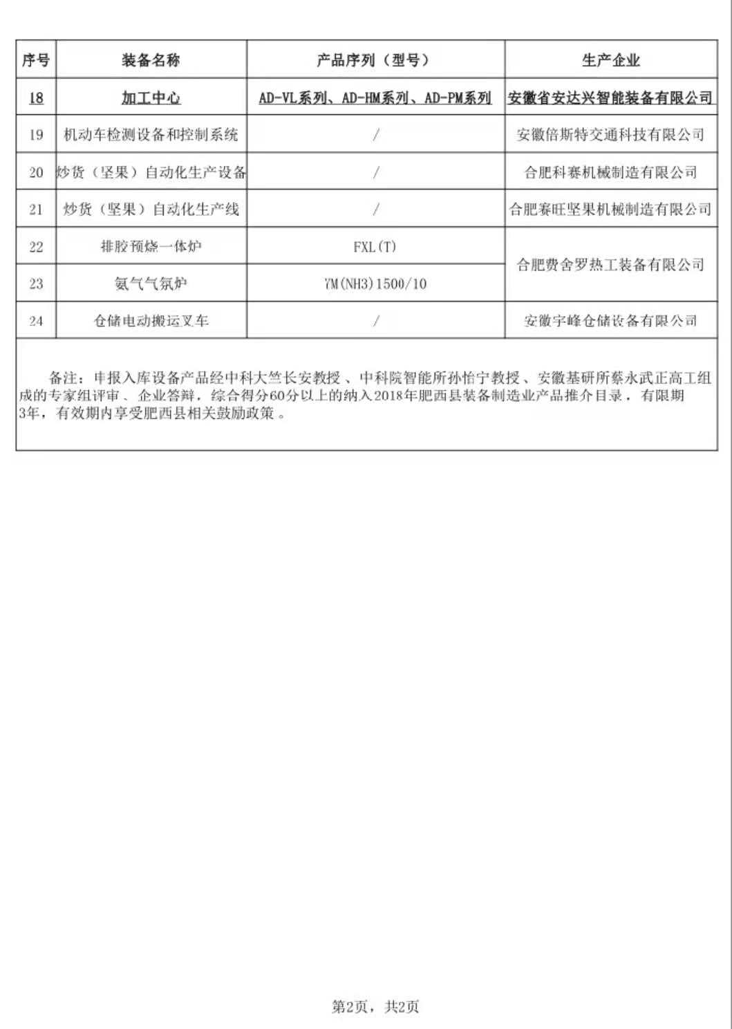 | 備注:申報入庫設(shè)備產(chǎn)品經(jīng)中科大竺長安教授、中科院智能所孫怡寧教授、安徽基研所蔡永武正高工組成的專家組評審、企業(yè)答辯,綜合得分60分以上的納入2018年肥西縣裝備制造業(yè)產(chǎn)品推介目錄,有限期3年,有效期內(nèi)享受肥西縣相關(guān)鼓勵政策。 | ||||